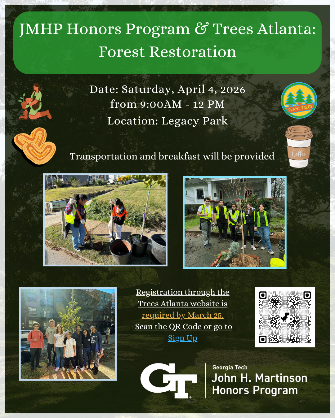 The Honors Leadership Council's Civic Service committee is partnering with Trees Atlanta, a local environmental nonprofit that protects and improves Atlanta’s urban forest. We'll be participating in a forest restoration project in Decatur Legacy Park on Saturday, April 4th from 8:00am to 12:30pm. Space is limited to 20 JMHP students. Activities include hand-pulling and cutting invasive plants such as English ivy, Chinese privet, and kudzu in a densely wooded area off trail. See the registration website for more event logistics.